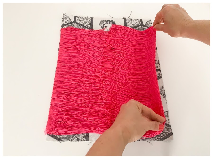 Colocar el fleco a ambos lados del rectángulo que tiene la medida de 30 cm por 39 cm, dejando libres los 4 cm del borde superior y un centímetro en el borde inferior, para las costuras.