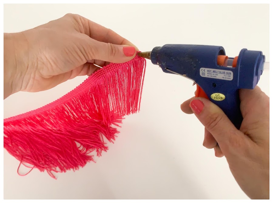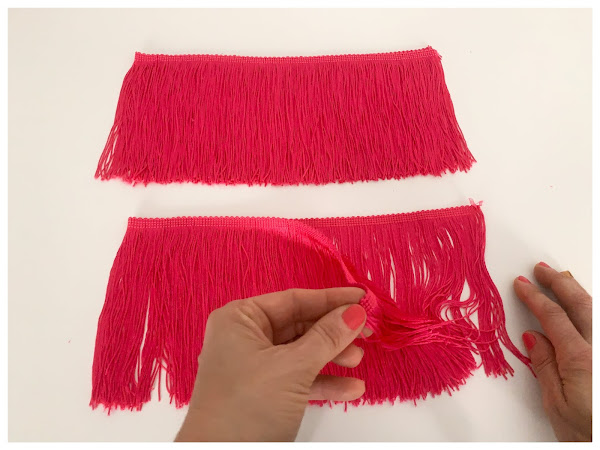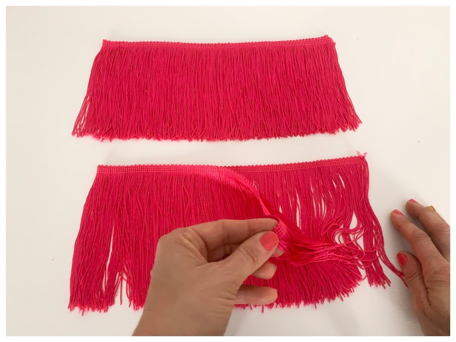 Doblar el fleco rosa para ponerlo doble y cortar dos piezas con una medida de 35 cm, que irán
