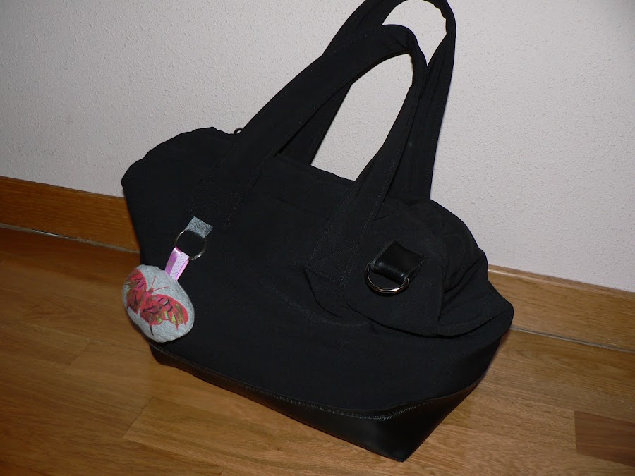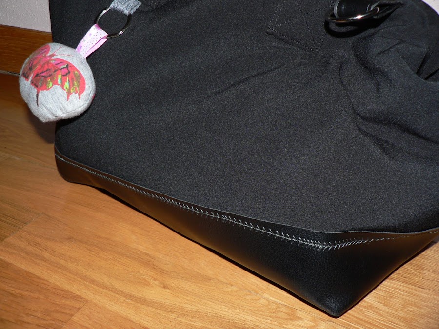 Buscaba algo muy básico, muy ponible, necesitaba un bolso para todos los días... Así que negro. Y como una vez leí en algún sitio que si quieres combinar dos telas pero no quieres introducir color has de usar las texturas.... pues combiné softshell y polipiel. La polipiel es fina, así que en vez de hacer el bolso con dos piezas es una pieza entera de softshell con una parte de polipiel cosida encima.