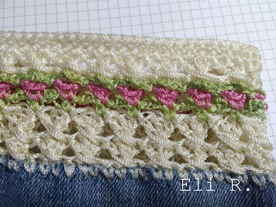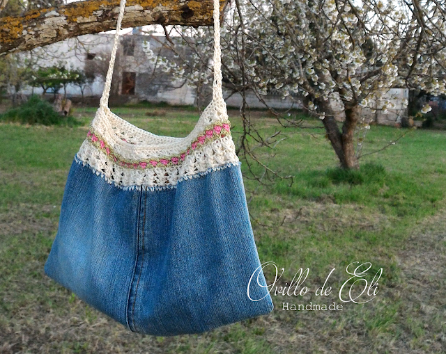 Para el asa he montado una banda de 5 puntos altos en 5 cadenas, tejiendo hasta obtener el largo deseado y montado en la bolsa Aquí les presento el bolso entre arboles de membrillo y persimones (caqui) en flor. El bolso también puede personalizarse creando rasgados en ciertas zonas, pegando algún bolsito externo, agregándole listones, parches de tela, botones, etc. creo que una adolescente lo diseñaría mejor... por ahora resulta un bolso de dama primaveral por lo colores tenues y la linea de florecillas, me gusta la idea de combinarlo con sandalias en jeans