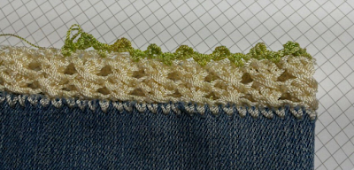 Vuelta 1: montar la primera linea con punto bajo, ayudándose de una aguja gruesa para atravesar el jeans y luego pasar el gancho