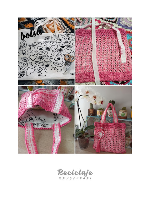 Como estoy que me atrevo con todo, pues también me he apuntado al crochet o ganchillo con trapillo, que es como le llaman al hilo de tela que se traen de Portugal y está ahora tan de moda. Así que me puse manos a la obra y este es el resultado. Debeis saber que , no solo es mi primer bolso, si no también mi primer trabajo en ganchillo.