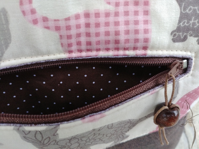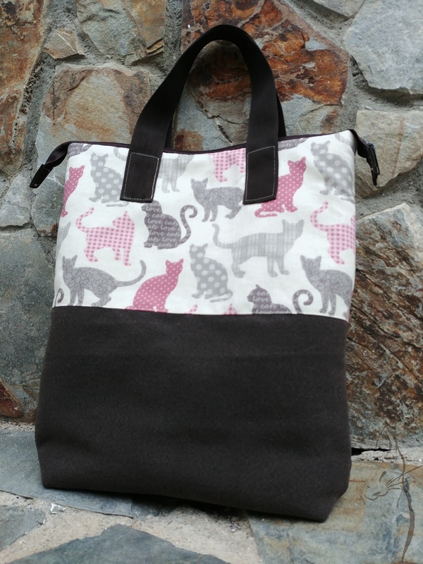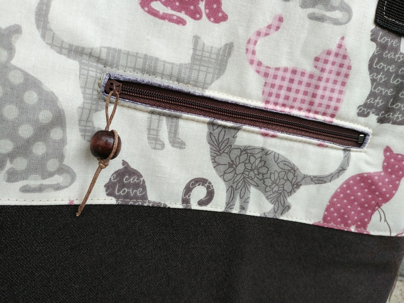 Además, al contrario de lo que suelo diseñar, este es más alto que ancho. Para reducir esta característica he combinado la tela principal (un patch de algodón precioso de Cal Joan con estampado de gatos), con una sarga marrón chocolate en la base.
