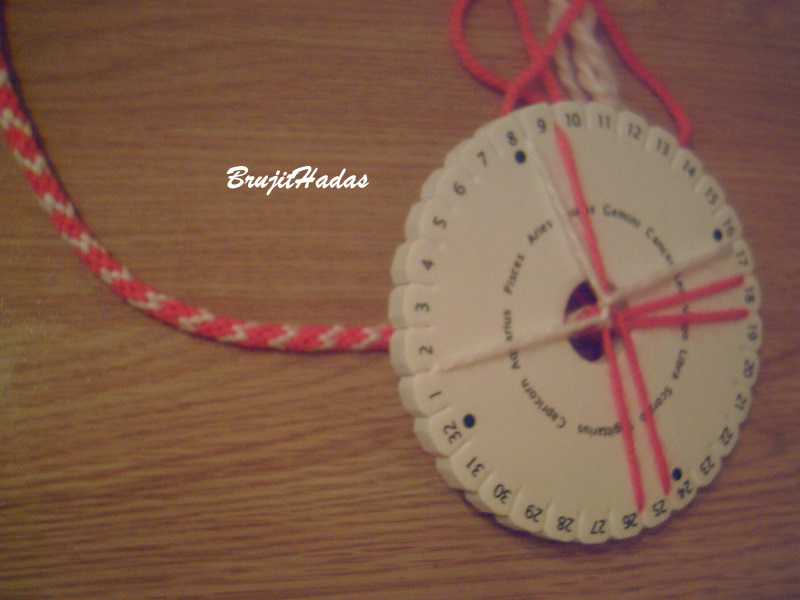 Si os fijais en el cordón también lo he hecho yo...con este invento... se llama Kumihimo...y ya veis que sirve para hacer cordones....y quedan muy chulos....!!!!