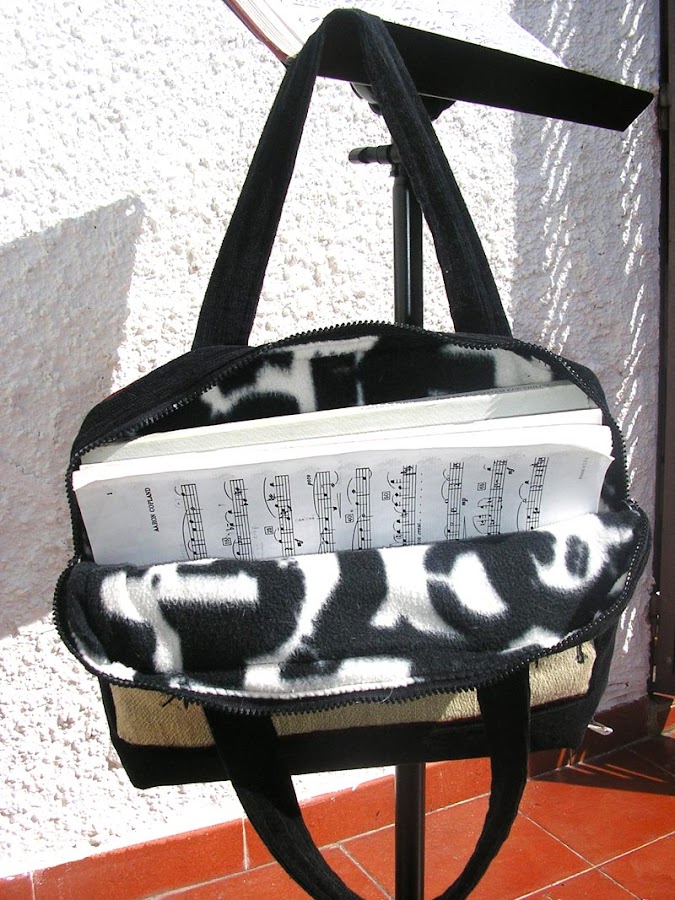 En esta ocasión mi hija vio la tela que teníamos para reciclar de un cojín y le encantó y enseguida se le ocurrió lo que necesitaba: un bolso para guardar las partituras de su clarinete.
