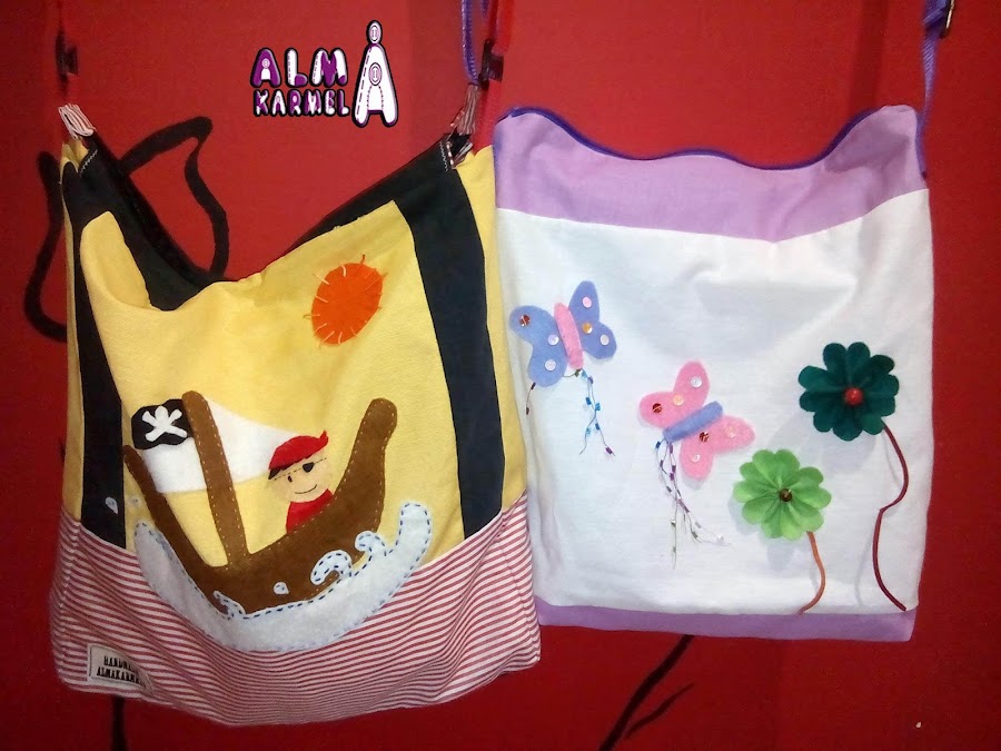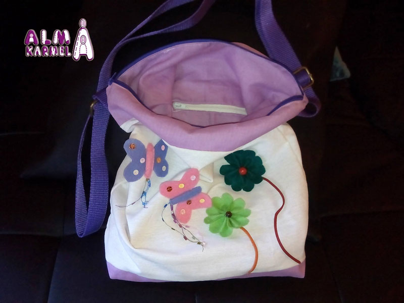 El bolso con los tonos elegidos y unas mariposa y flores para terminar el conjunto, realizados en este caso en fieltro..