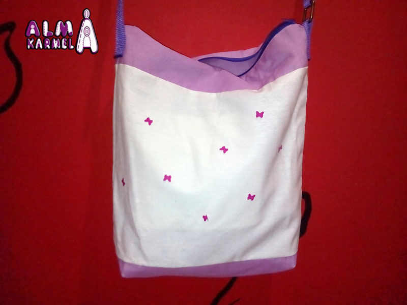 Sandra se puso en contacto conmigo, porque quería un bolso para la primavera-verano, y tenía muy claro cómo: blanco y morado y con mariposas. No es la primera vez que me encarga algo con esos colores y mariposas, creo que le gustan.... lo podéis ver aquí y aquí.