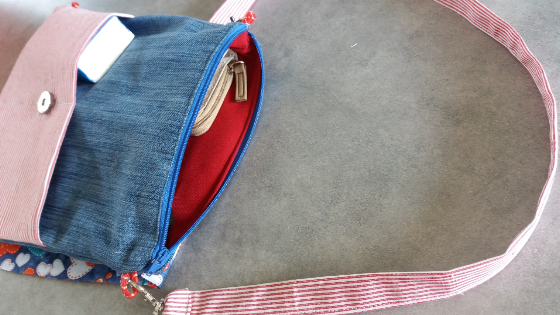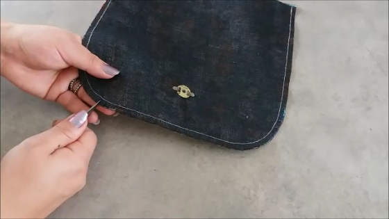 Preparada la solapa la cosemos a la parte trasera de bolso teniendo cuidado de apartar el forro. Empezamos a coserla y a los 3 cm nos detenemos para colocar una de las agarraderas donde irán enganchados los mosquetones.