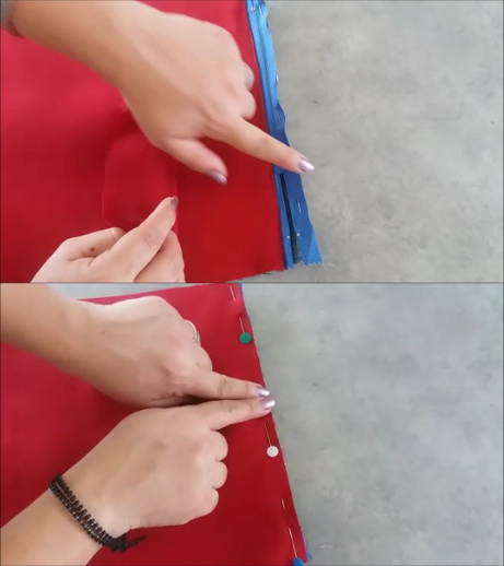 Luego juntamos las piezas del forro por un lado y las exteriores por el otro, colocamos alfileres para que no se muevan y cosemos alrededor. Antes de llegar a la cremallera, levantamos y metemos otra agarradera y seguimos cosiendo