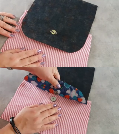 Ahora tomamos las piezas del bolsillo y las colocamos una sobre otra enfrentando sus derechos y cosemos con puntada recta por la parte de arriba. Ponemos del derecho, planchamos y pasamos otra costura por encima y pegadito al borde; luego colocamos el broche imantado, para ello ubicamos el centro de la pieza y de allí 4 cm hacia abajo y marcamos utilizando la arandela del broche como guía.