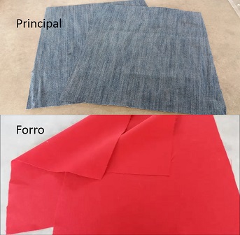 Para la pieza principal: Dos piezas en la tela de tu preferencia, yo por mi parte voy a usar vaquera (mezclilla, denim, jeans). Y dos piezas en tela para el forro.