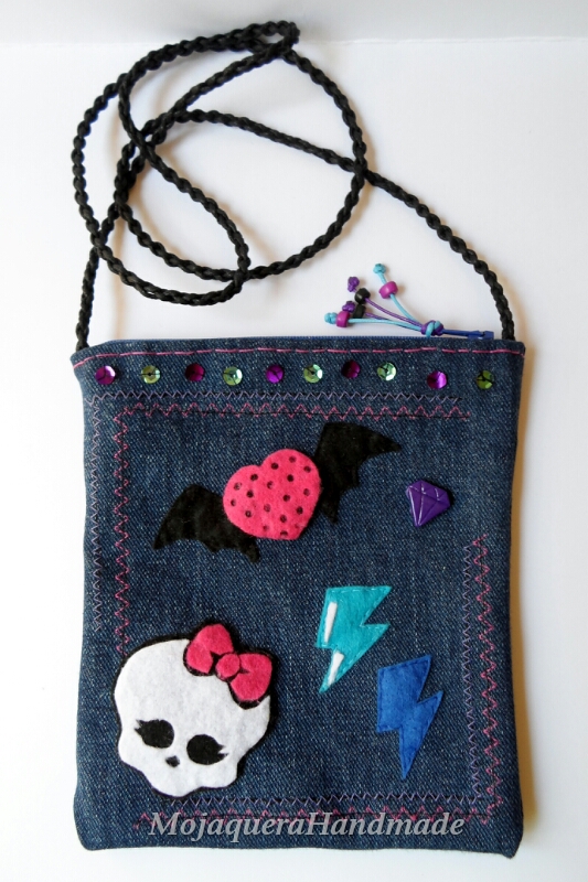 Bolsito infantil de tela vaquera con decoraciónMonster High. Os invito a visitar mi página de Facebook aquí
