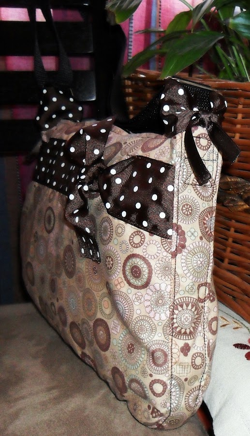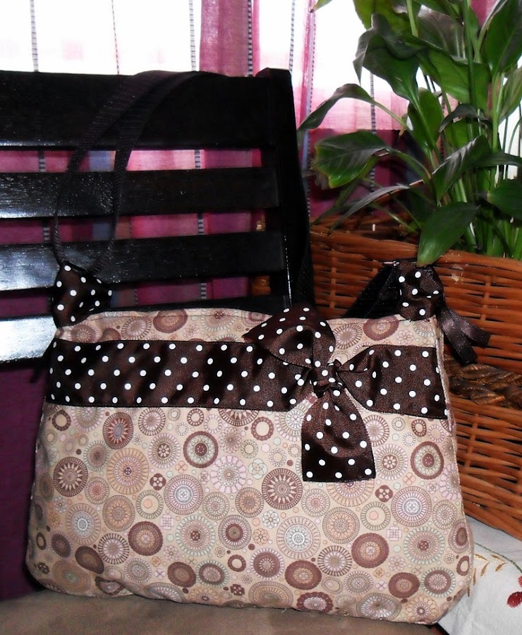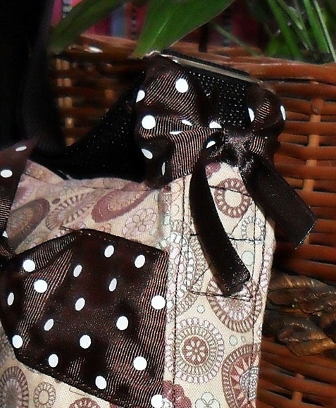 Esta confeccionado en tela 100% algodón estampado en tonos marrones, tiene una cinta color chocolate con lunares blancos, para su cierre tiene cremallera y su asa es ajustable.