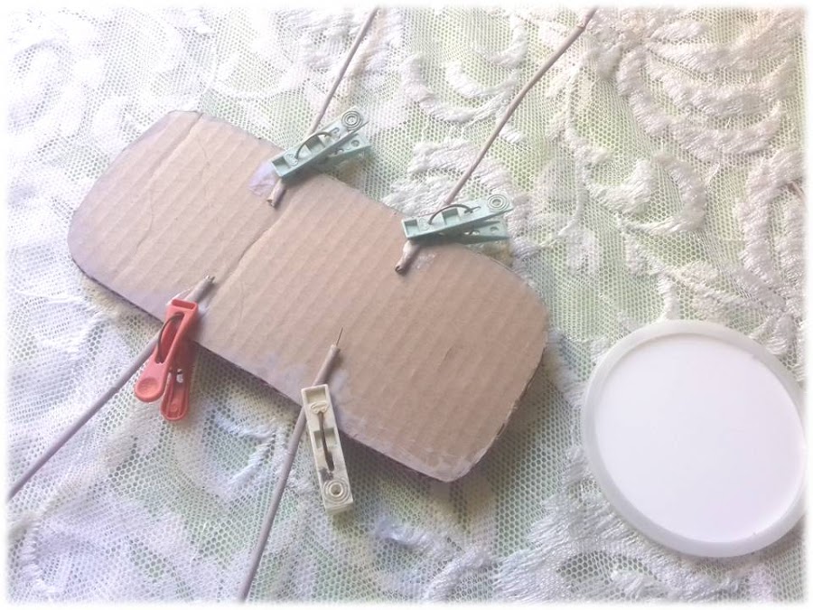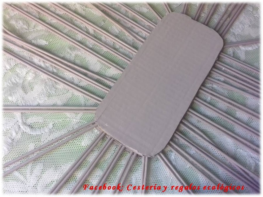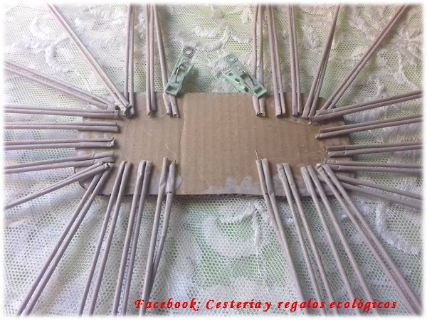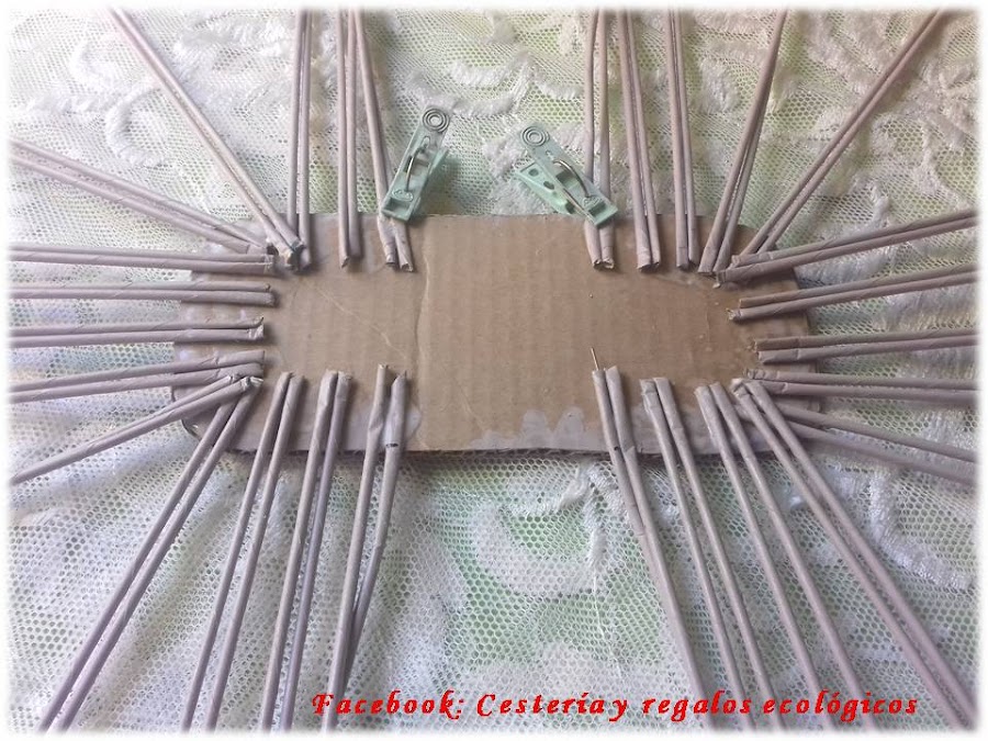 Se pegan los tubitos de papel por toda la orilla de la primer pieza de cartón...