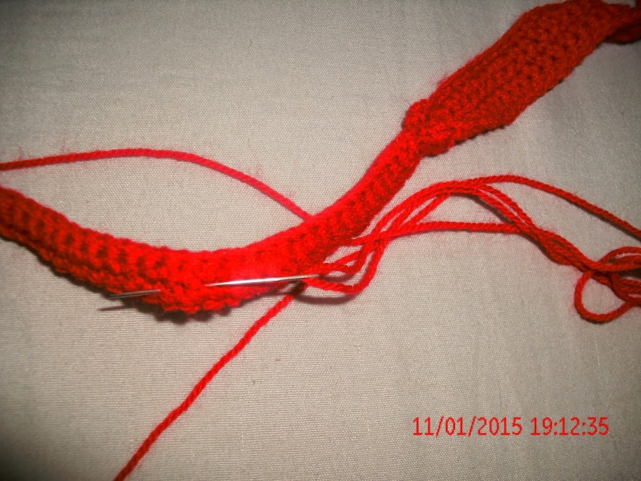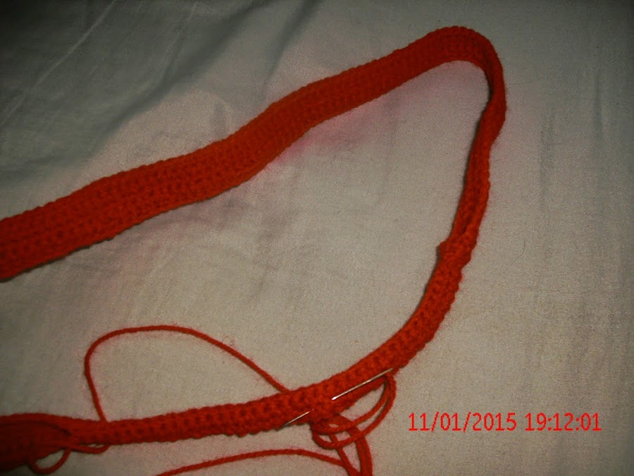 LUEGO, PARA FORMAR LA MANIJA TEJÍ 240 CADENAS Y EN CADA UNA DE ELLAS TEJÍ UN PUNTO BAJO ASÍ HASTA TENER 6 VUELTAS HECHAS, DESPUÉS UNÍ LOS EXTREMOS FIJÁNDOME QUE NO QUEDE TORCIDA LA TIRA Y DOBLÁNDOLA LA COSÍ FORMANDO UNA ESPECIE DE TUBO