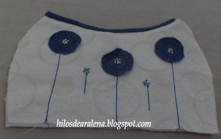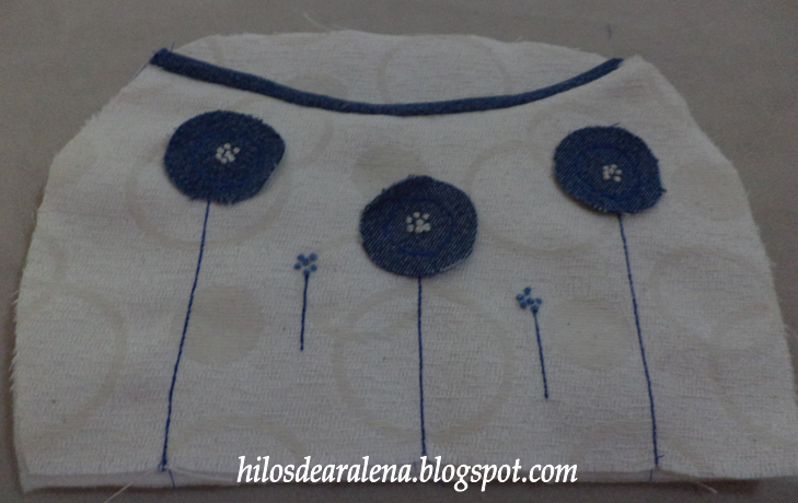 Pueden bordar o colocar un aplique . O ambas cosas como he heho yo ! Son círulos de jean con el centro bordado con punto nudo. Intenté hacer algo así como las flores del campo a las que soplamos las semillas plumosas.