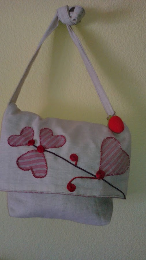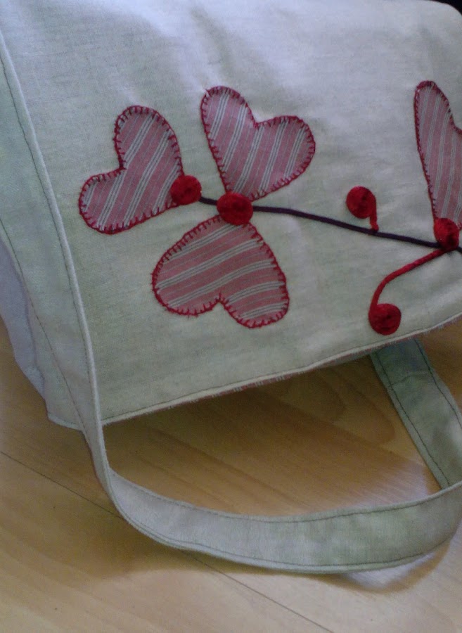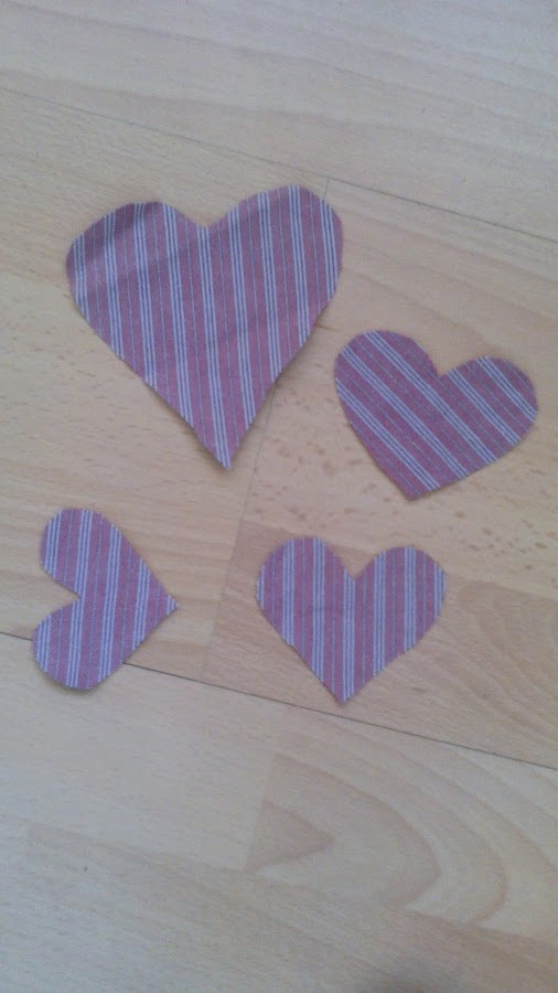 Lo he cosido de esta manera, esto es el forro del bolso, también de la misma tela he cortado unas aplicaciones con forma de corazón, les he puesto entretela thermoadhesiva.