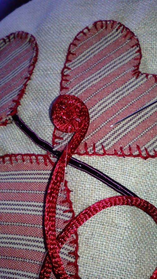 Para rematar las aplicaciones punto de festón y para hacer un dibujo que me gustara cola de ratón y cordón de soutache, recuerda quemar las puntas del cordón para que no se deshilache.