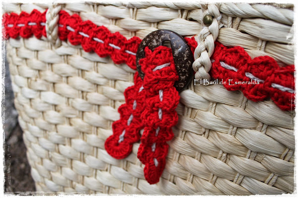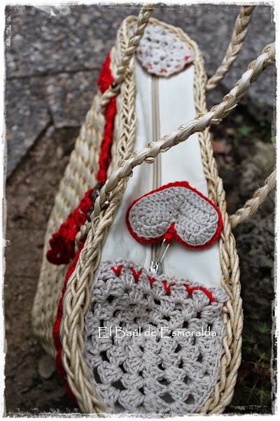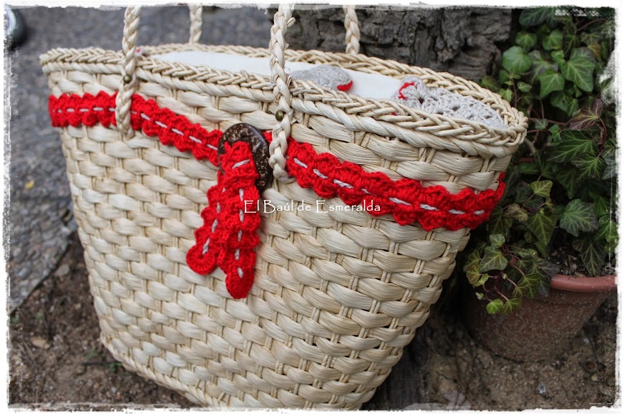Os propongo este bolso de mimbre personalizado con ganchillo: