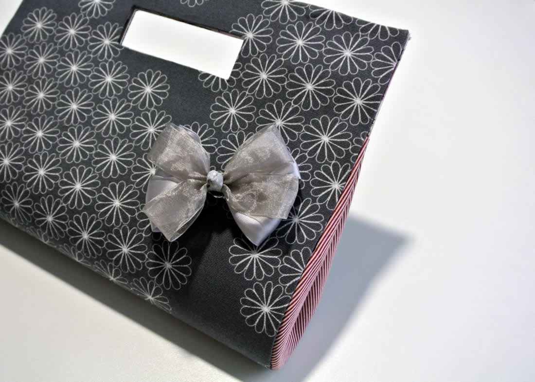 Elegí una tela gris con flores para el exterior y para dentro la tela de los recortables que sabía que le gustaba. En los laterales le puse una tela de rayitas en blanco y rojo para que hiciera contraste.
