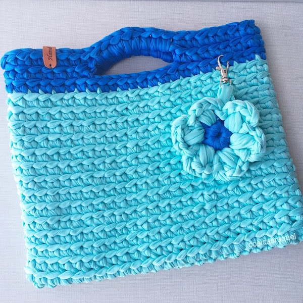 Hola! Te presento mi bolso con adorno de flor para esta primavera, un bolso tejido con tela ligera (fetuccia o trapillo pluma) muy ligero , fácil de hacer y super ponible.