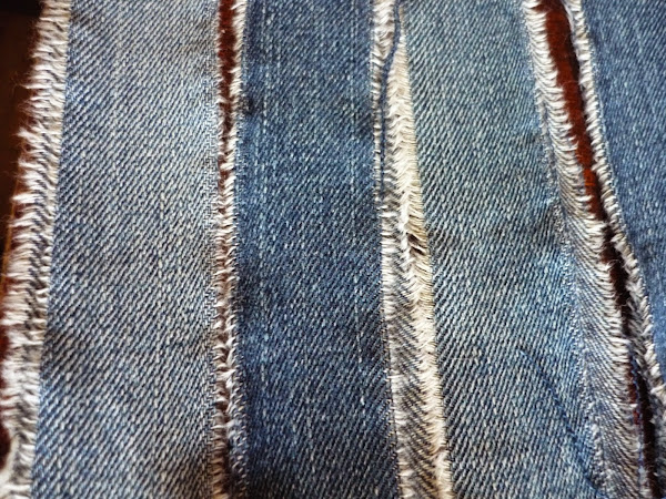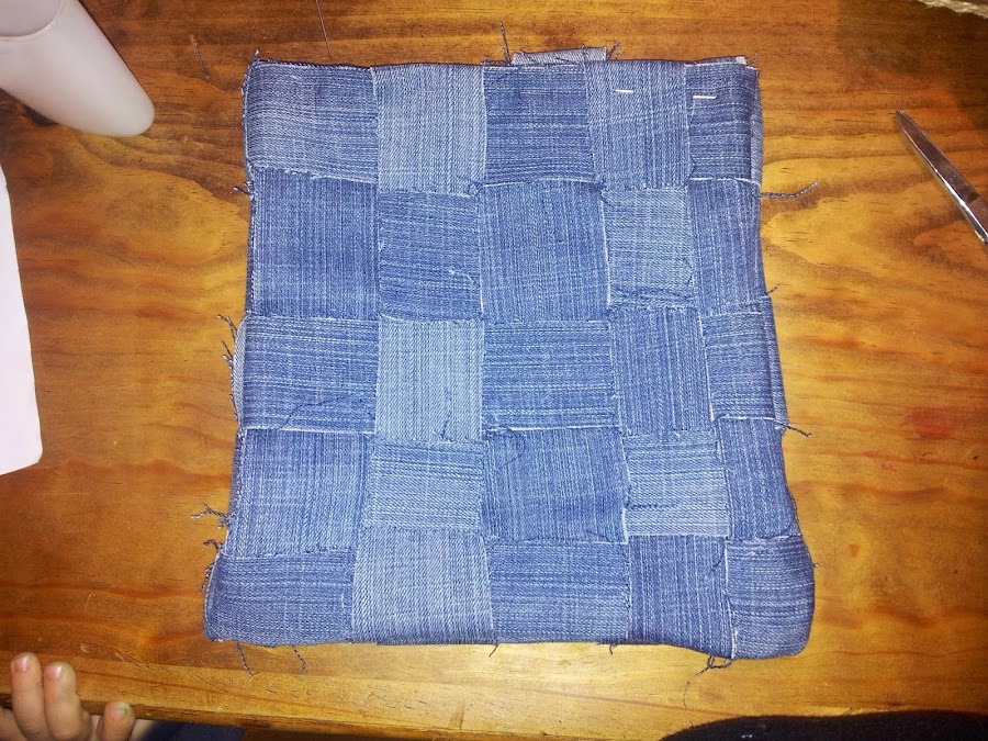 Cortamos a tiras de unos 4 ó 5 cm. de ancho por unos 50 cm. de largo. Unimos las tiras por la parte superior y vamos pasando unas por encima y otras por debajo.