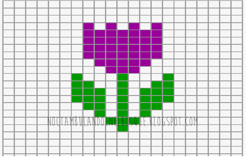 - En esta vuelta empezamos el dibujo. Seguiremos haciendo lo mismo que el paso anterior durante toda la labor, teniendo en cuenta que tendremos que rellenar los huecos que están dibujados con un punto alto, es decir, en lugar de saltar un punto y hacer una cadeneta al aire, haremos otro pa a continuación y así quedará relleno porque no hemos saltado nada.