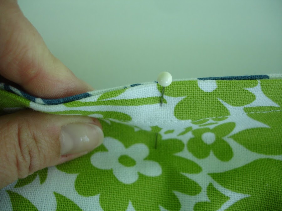 Corresponder las 2 piezas hasta en las costuras laterales. Ponga un alfiler a cada lado de la costura, utilizando otro número de identificación para empujar los bordes de los márgenes de costura ligeramente hacia abajo dentro de la bolsa "sandwich" para que no se muestran después de haber cosido el borde.