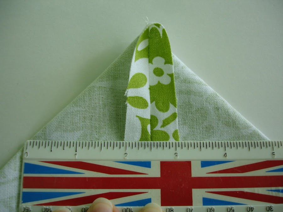 Para más altos totebags que suelen hacer la escuadra de 4 ", pero dado que esto es más de una bolsa de mercado libre, he hecho 5".No importa demasiado, siempre y cuando sean compatibles.Usted quiere pellizcar y apretar el triángulo de lo que es aún, y si usted está haciendo la escuadra 5 ", medir a través de donde es de 5" y usted sabe que es, incluso si la unión se centra en el punto medio - 2.5 " .