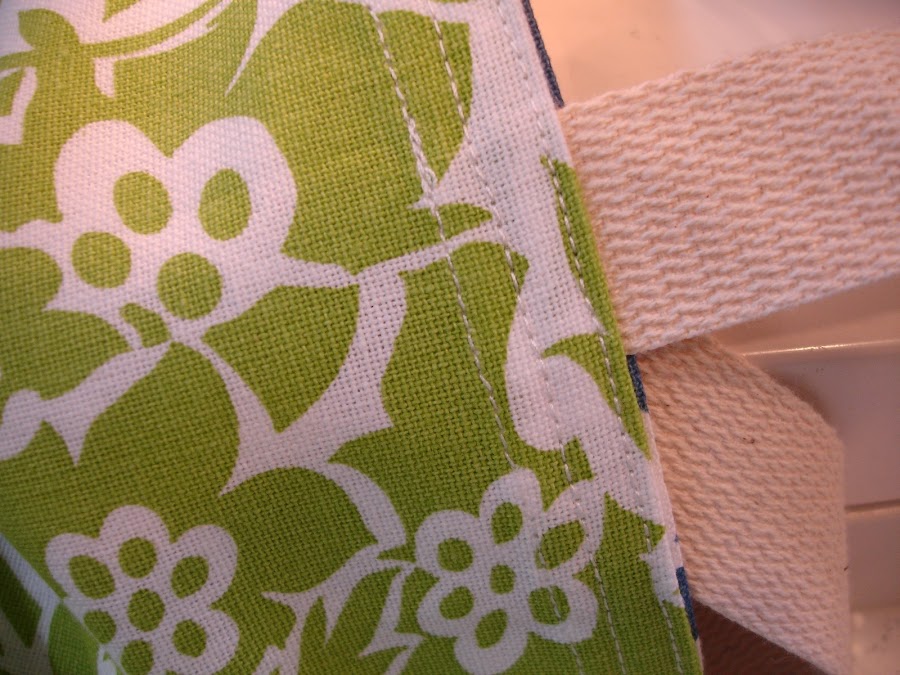 Paso 9: mantener todo junto. Ahora ya está listo para coser alrededor del borde superior. Vaya despacio y asegúrese de que están ganando terreno tanto en la bolsa interior y exterior. Cosí una escasa 1/8th de una pulgada del borde. En la foto de abajo, la línea de costura de la izquierda es el borde del paño de cocina que ya estaba allí. La línea de la costura de la derecha es mi costura que asegura las dos bolsas junto y la correa en su lugar.