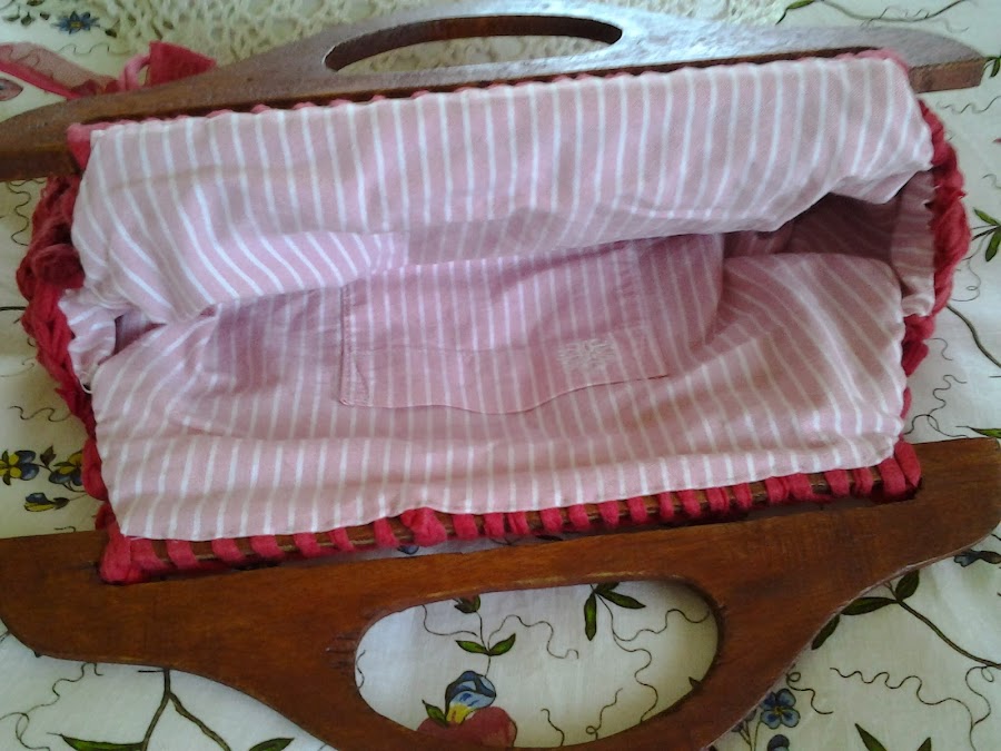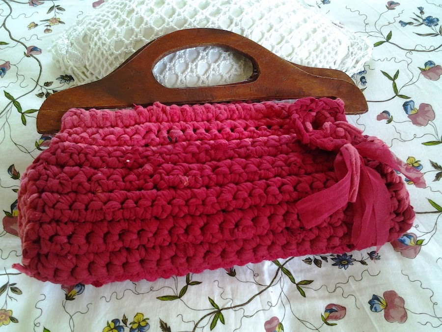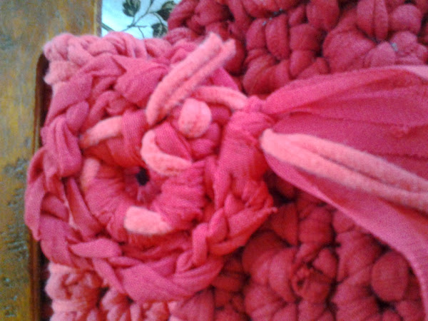 Hola a tod@s.Os enseño lo nuevo que hice.Con dos camisetas viejas ,una aguja de ganchillar,una camisa que no servia(para el forro)y un poco de tul rojo (para la flor). !Ah! y el asa es de otro bolso antiguo.