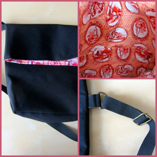 Y el tercero, es de una loneta de color negro, ya que la dueña lo quería de ese color sí o sí, no me dio opción, un poquito más grande que el original, y con el triángulo inferior más ancho. Para el interior he utilizado una tela de algodón en un tono anaranjado, con lunares y con dibujos dentro de óvalos de molinos. Lleva el mismo bolsillo interior, y la correa, he utilizado una comprada, porque la dueña la quería corredera, y me pareció que daría mejor resultado, tanto los piquetes como la presilla son en color bronce.