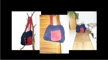 Después de pegar unas de las asas unimos la tela a la toalla. Luego ya podemos colocar la otra asa y tenemos terminado el bolso.