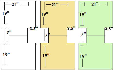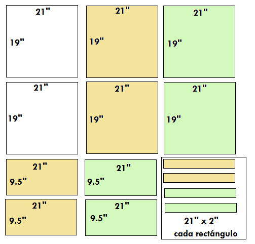 - 2 rectángulos de 9.5pulgadas x 21 pulgadas (si lo planean hacer reversible serían 4 rectángulos de estos, 2 de cada tela)