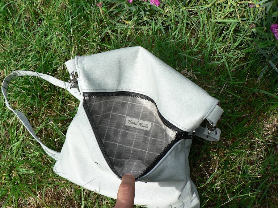 Hice una versión muy sencilla. En piel color gris piedra, que ahora en verano apetece color claro y creo que pega con todo. Quería ponerle algo en la solapa pero no quería añadir color ni dada estridente ya que quería un bolso liso. Así que pensé, cómo puedo "estamparlo en liso"? Pues fácil! Añadiendo textura. Hice un bordado con la máquina de coser en el mismo color. Así le da un toque pero sigue siendo un bolso gris.