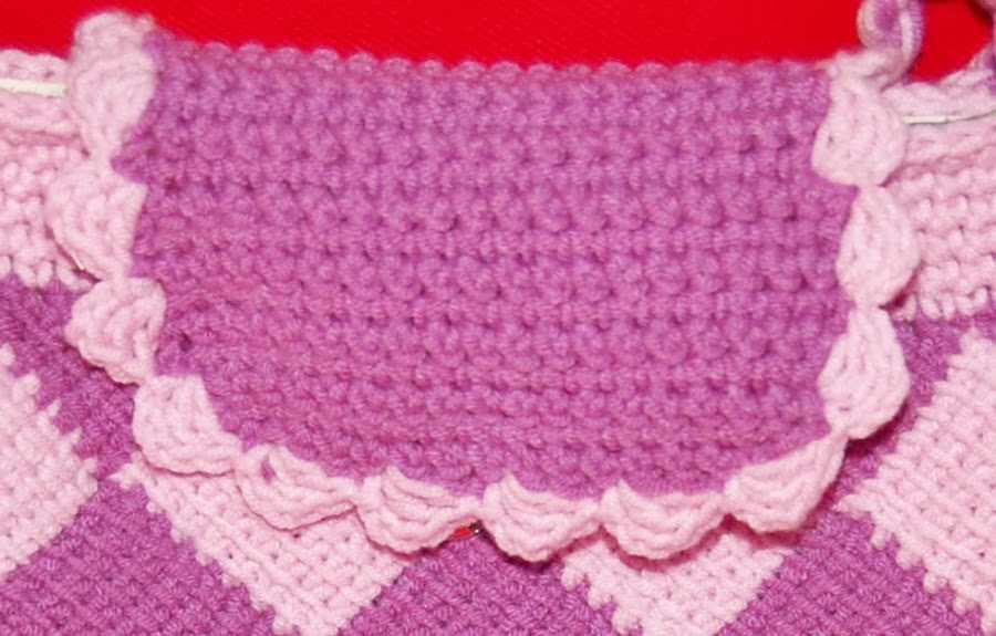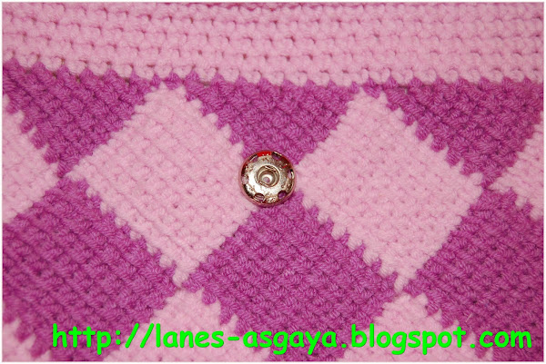 Para hacerle la tapa, levanté en el centro del bolso 18 puntos (quizás hubiera quedado mejor más estrecho, 14 puntos) tejí 10 vueltas a puntos bajos, y otras 6 más, menguando 1 punto a cada lado para hacerle una forma redondeada. Después,con el otro color, un remate sencillo: 3 cadenetas + 2 puntos altos en el mismo punto, saltamos 2 puntos y cerramos con un punto raso. Ahí mismo subimos 3 cad + 2 p. altos, saltamos 2 puntos y cerrar con punto raso. Repetir...