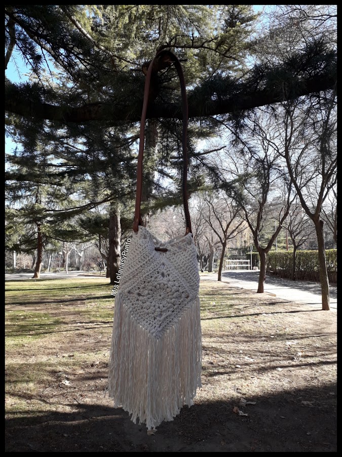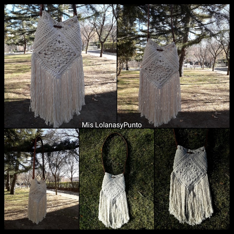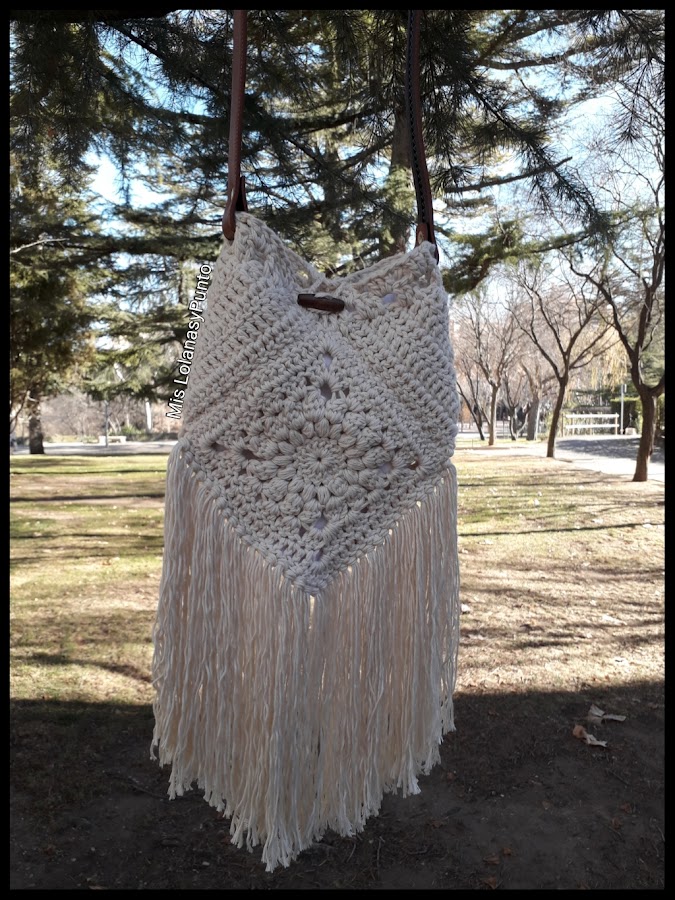Está tejido a ganchillo. Como se puede ver en las fotos, son dos granny square cuadrados, y dos triangulares lo que forma la base de este bolso.