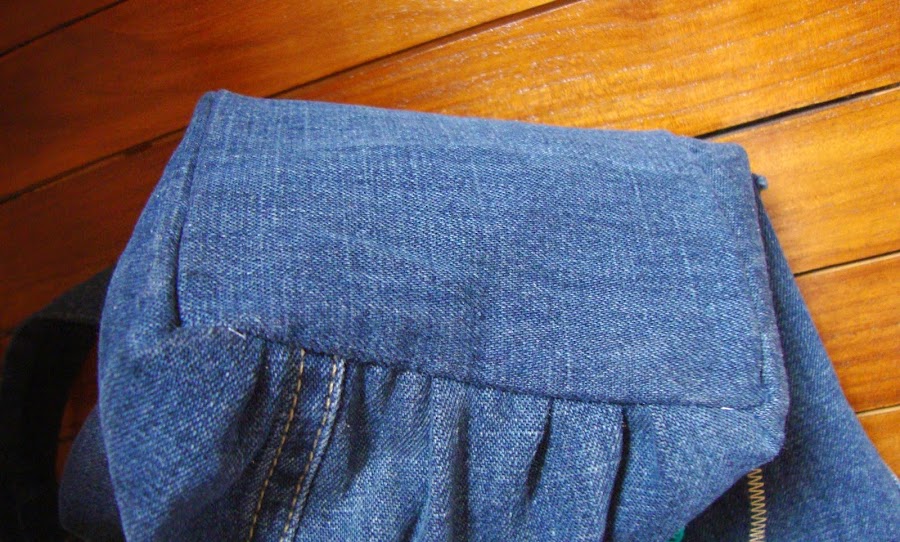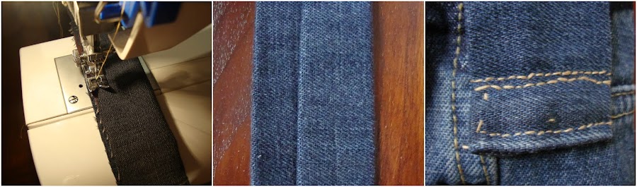 La correa sale también de unir varios trozos de tela formando una tira larga, que cosí por el revés y después volteé sobre sí misma con ayuda de algo duro como un imperdible (cuesta bastante porque la tela vaquera es dura y se resistía, otra opción sería preparar las costuras vistas desde el derecho para no tener que enredar de esta forma pues me llevó un buen rato). Fijada a ambos lados con 3 costuras de seguridad, éstas las hice a mano porque pillaba la doble costura del vaquero y resultaba difícil con la máquina. Además así os aseguro que quedaron bien fijas-