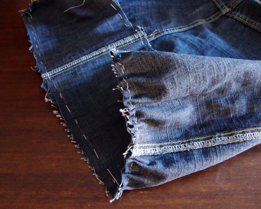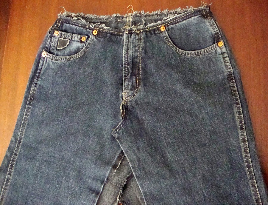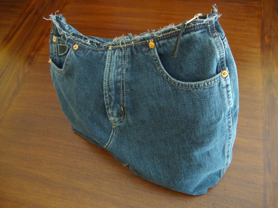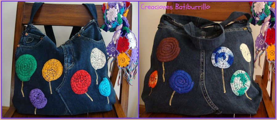 El bolso lo hice reciclando la parte de arriba de unos pantalones vaqueros de los que ya había aprovechado hace tiempo los bajos (de elefante) para una falda y la cintura no recuerdo ni para qué.