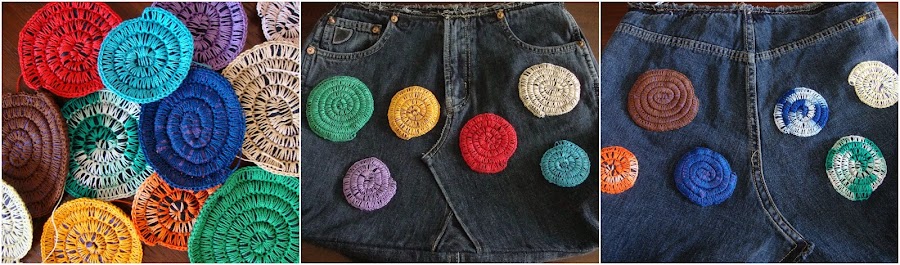 Una vez hemos tejido un buen montón de espirales de crochet sobre trapillo, las podemos unir y hacer cualquier tipo de composición con ellas, igual que con los grannys que se han vuelto a poner de moda, pero esta vez, yo las he transformado en apliques.