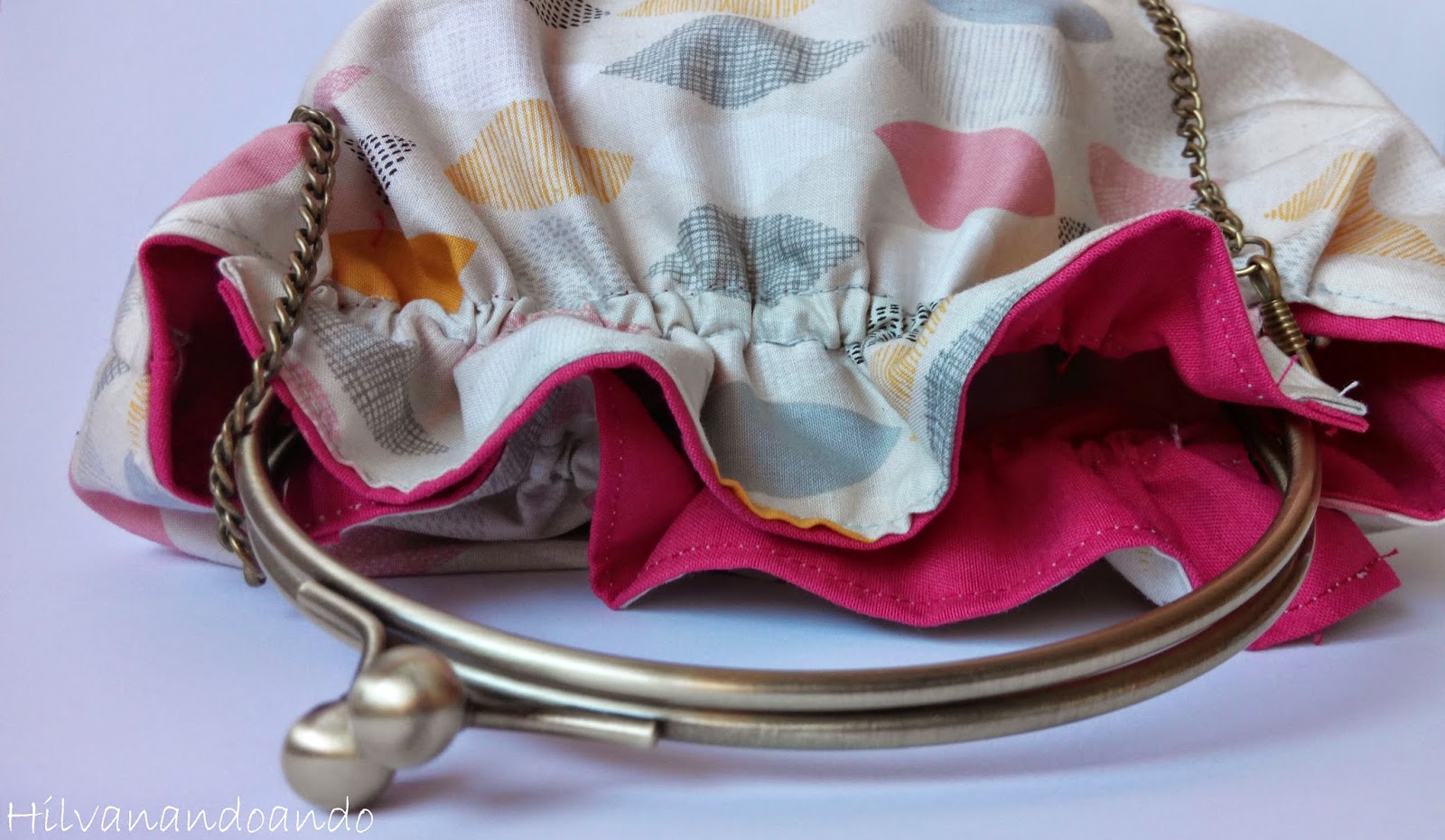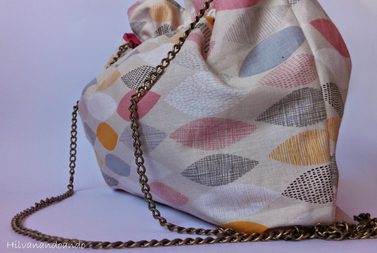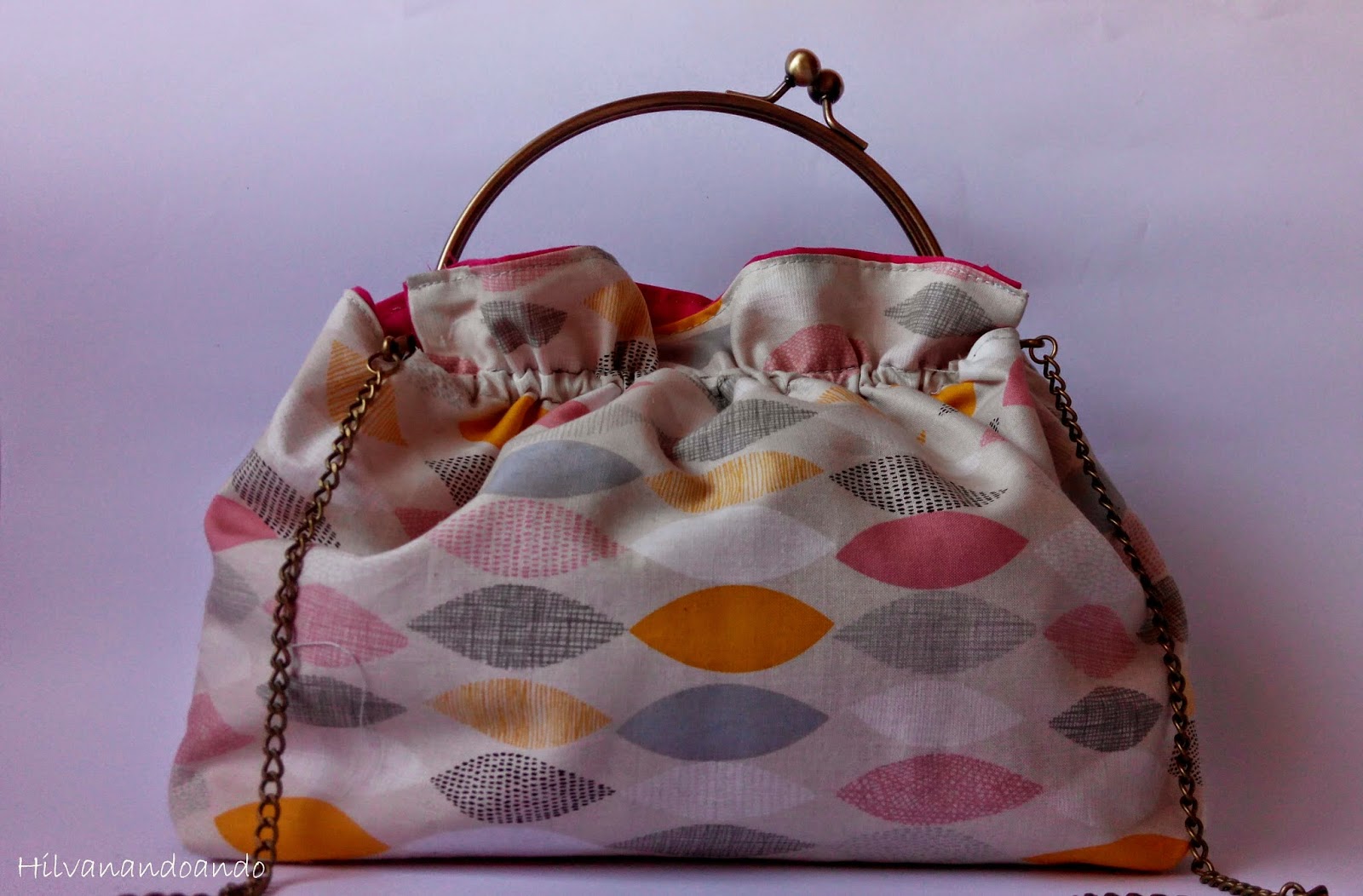 Lo bueno es que es un bolso dos por uno. Como ves el interior está cosido en una loneta en tono rosa fuerte para contrastar con los tonos pastel del exterior...peeeeero si te apetece puedes quitar los pasadores y cambiarlo, poner el rosa en el exterior y los tonos pastel en el interior!!