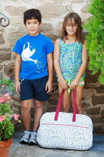 El patrón tiene dos tamaños: bolso de fin de semana o bolso de mano. Yo hice el grande porque justamente estos días hemos estado en Lleida y me venía bien. Cargué la ropa de los tres pompones para dos días y todavía me quedó un poco de espacio para el neceser y unos zapatos de recambio de la pompona, así que es bastante grande.