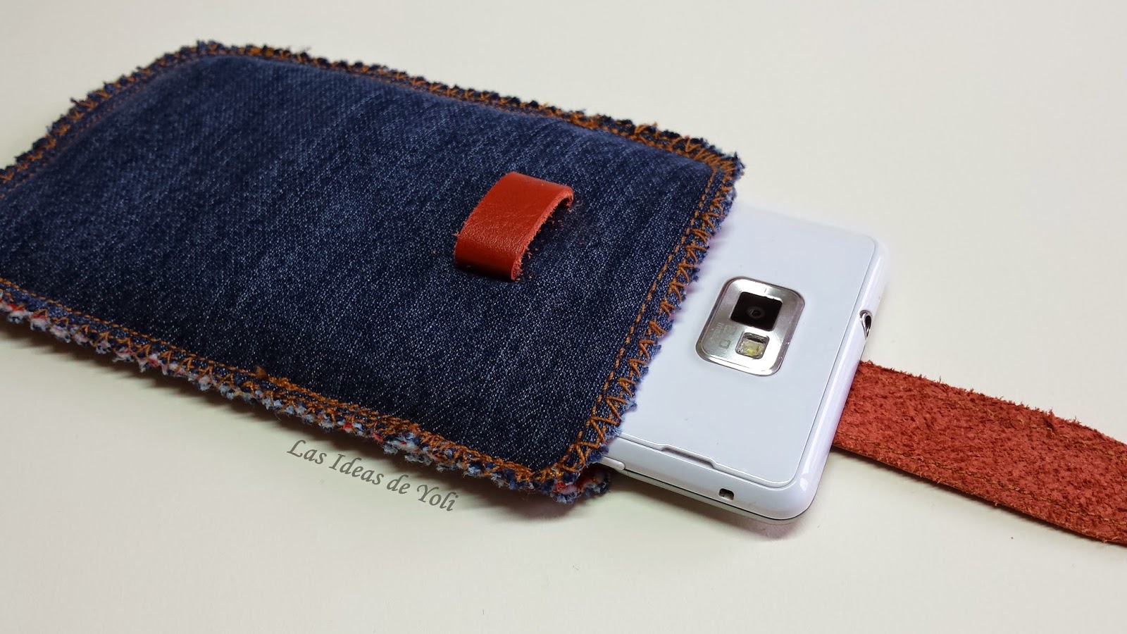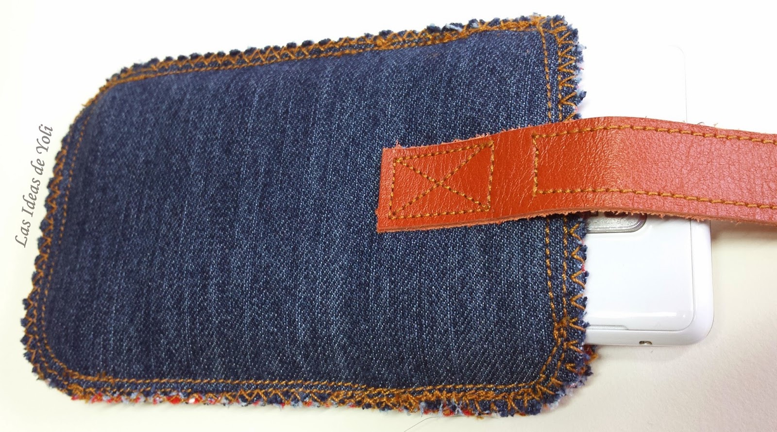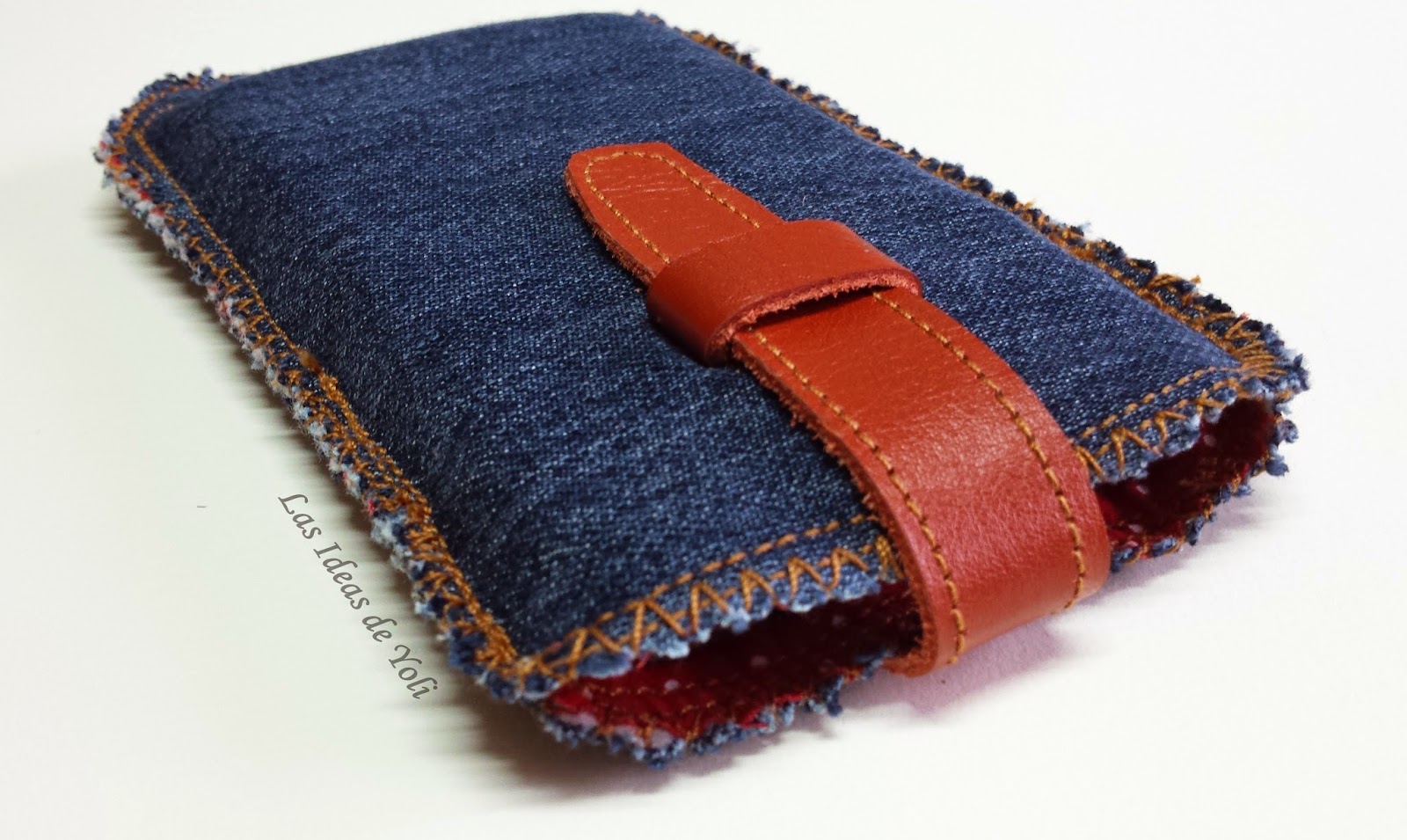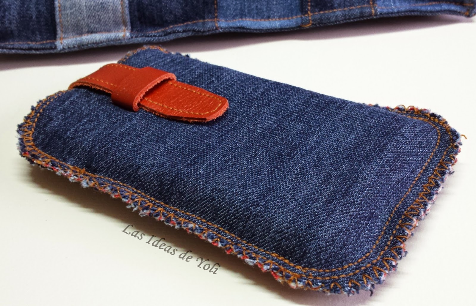 También la he hecho una funda para para su móvil con vaquero y el forro interior con tela roja de lunares a juego del bolso.