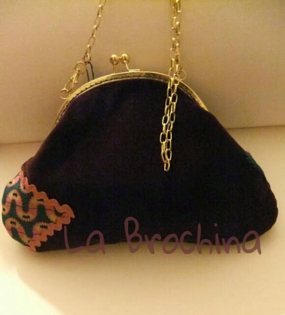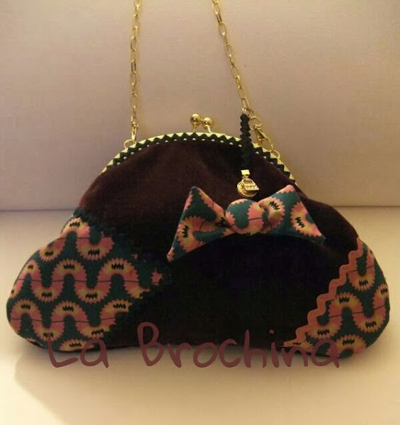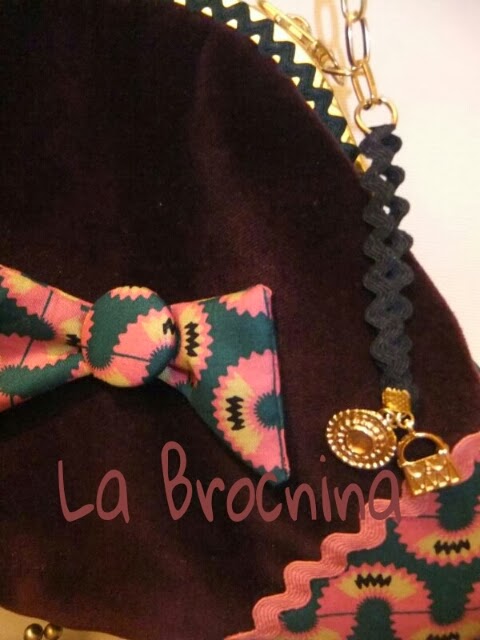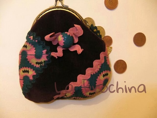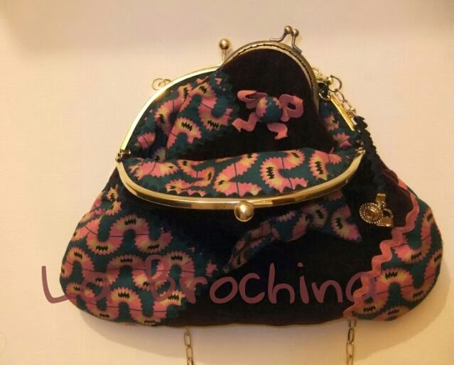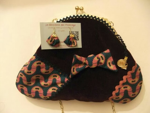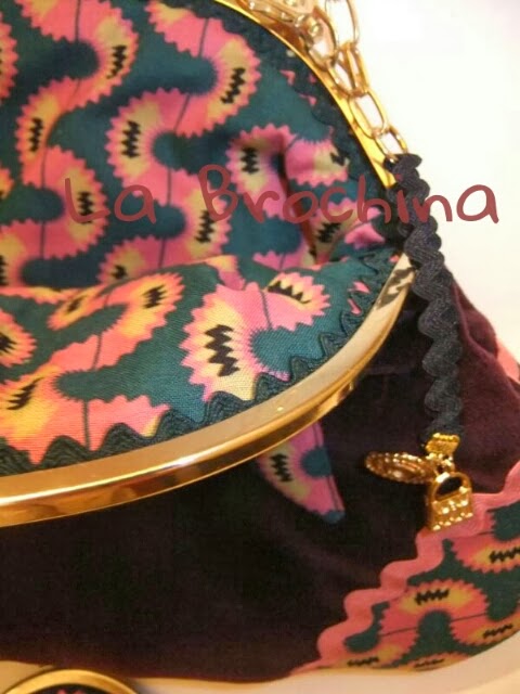Bolso con boquilla dorada, en color burdeos y tela de algodón con un estampado muy original, con los colores estrellas de este invierno. Y monedero a juego.