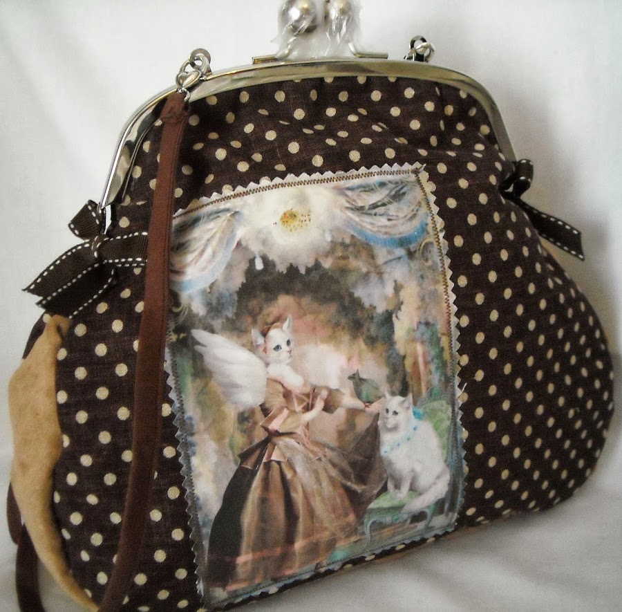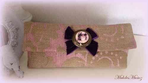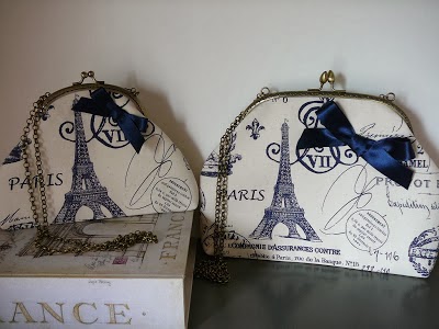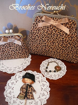 Dos bolsos con boquilla, en chenilla azulón y lino estampado en print animal. El primero es pequeño pero maton, boquilla en color oro viejo, puntilla tipo bolillo. Cadena, flor, en oro viejo como la boquilla. Detalle del interior. Con pendientes a juego El segundo es tipo maletín, con pasamanería y charm de corazón.. Con pendientes a juego. Detalle del interior.
