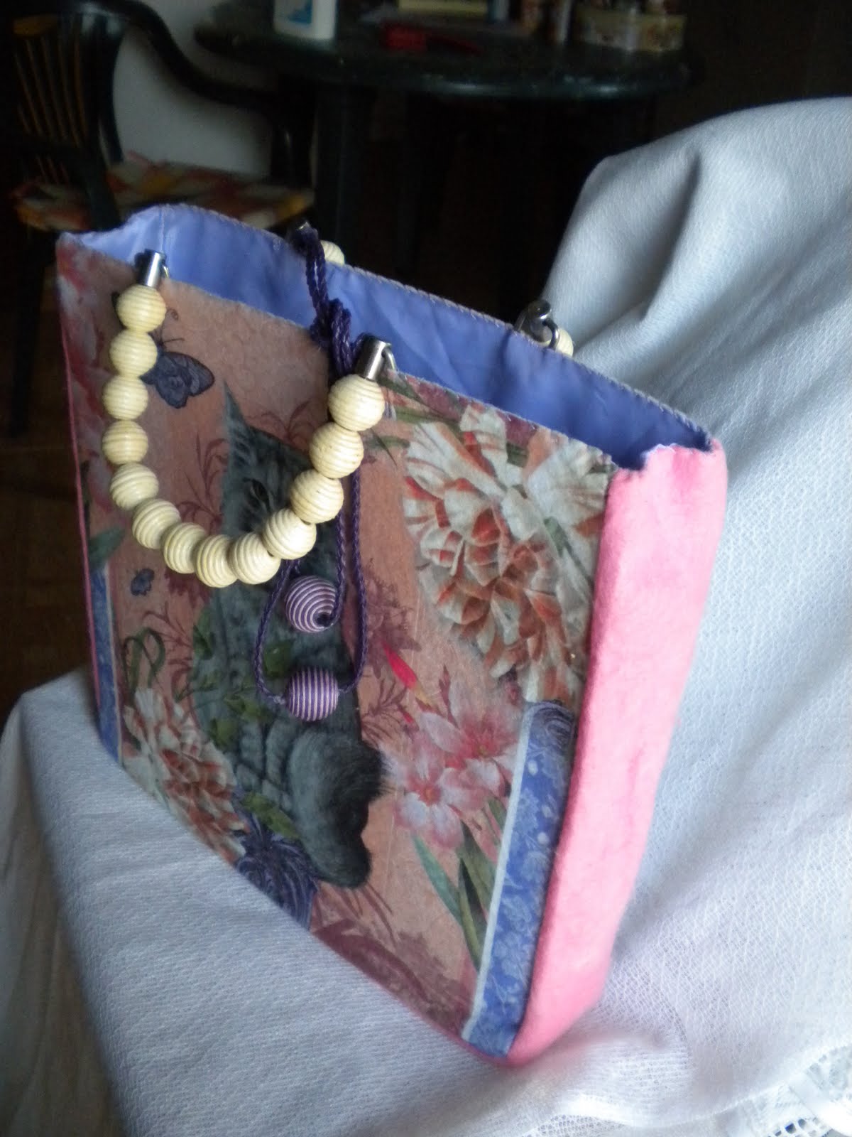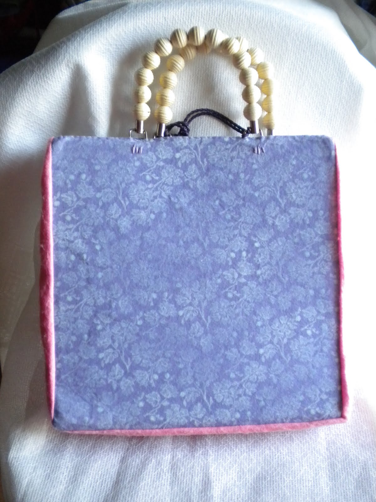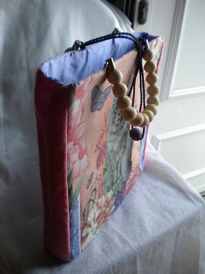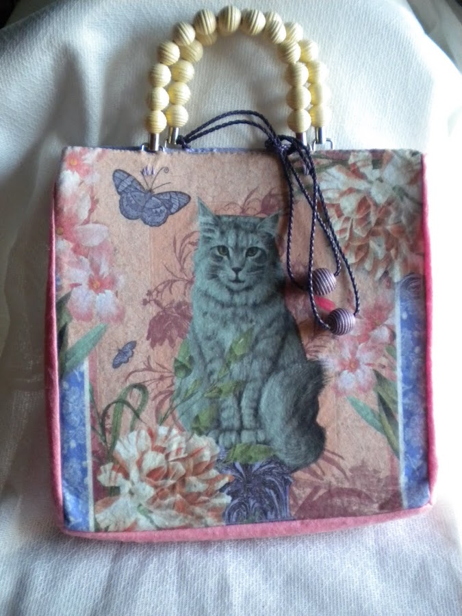 No me gusta la costura, me agobia, salvo el punto de cruz, ese sí me gusta mucho, pero por desgracia no puedo hacerlo porque tengo síndrome de tunel carpiano en las dos manos y mi vista tampoco está para andar contando cuadraditos. Pero descubrí este fieltro decorado y no me pude resistir a convertirlo en dos bolsos. Me gustaría haberlos cosido a máquina, pero como no tengo, tuve que hacerlos totalmente a mano, con mucho esfuerzo y el stress de estar haciendo algo que no gusta demasiado. Por el medio tuve que pintar algún cuadro para relajarme, pero al final los terminé. Y aquí están.