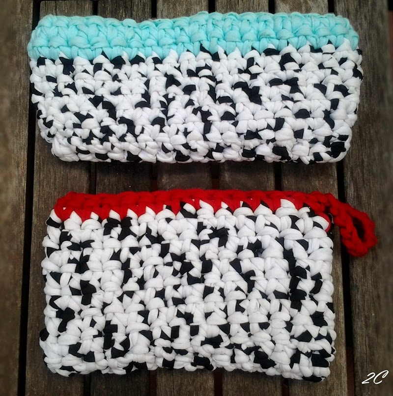 Estas dos carteras de mano que hoy os enseño las tejí también este verano, en mis vacaciones. Este año en lugar de tumbona,sol y un buen libro para leer, lo he sustituido por tumbona, sol, aguja de ganchillo y trapillo. Ya retomaré la lectura en otro momento. A la playa no me he llevado el trapillo, ¡sino me matan!.