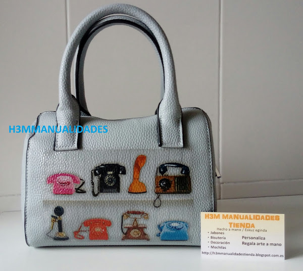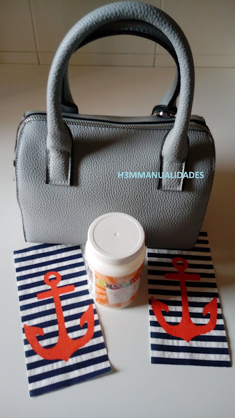 Compré dos bolsos, lisos, en un color que me gustó mucho: azul claro. Enseguida los vi decorados de alguna manera. Así que, nada más llegar a casa, rebusqué entre la cantidad de servilletas que tengo y encontré dos que encajaban estupendamente, a mi parecer...: un ancla y unos teléfonos antiguos