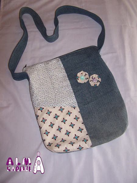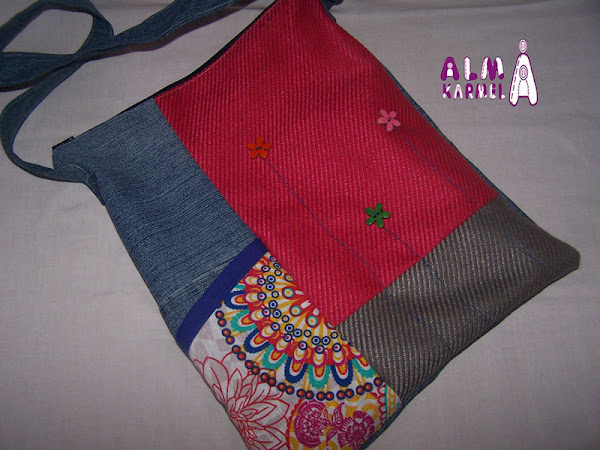 También dividido en varias piezas, pero de corte distinto y con un bolsillo exterior( la tela de mandalas) para poder guardar cosas de las que necesitamos llevar a mano, como pañuelos, llaves...
