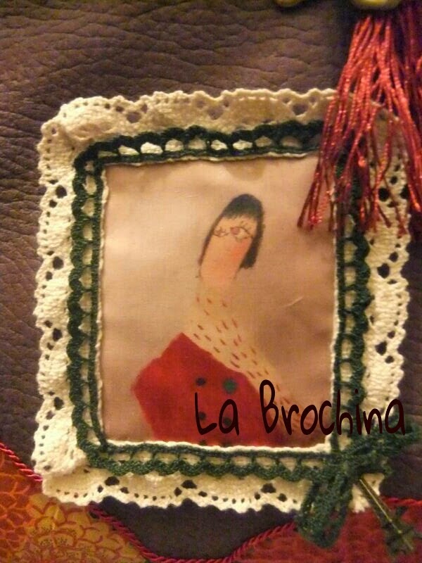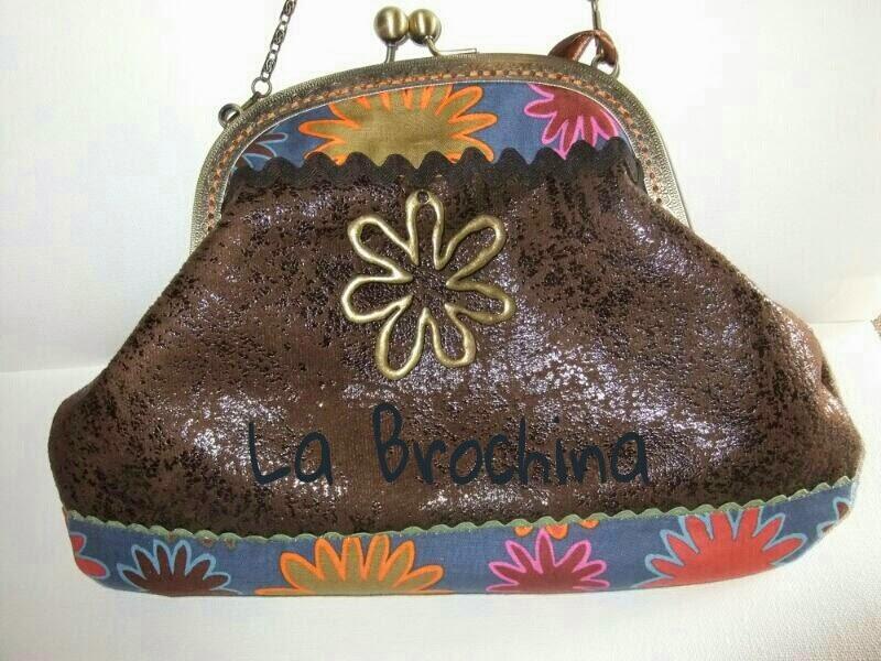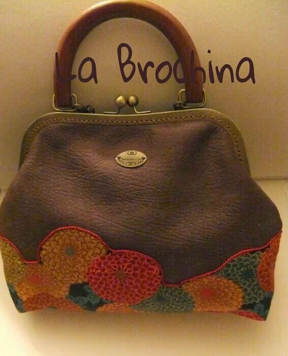Bolso con boquilla metálica, asa de madera, cadena y polipiel color vison, combinado con tela de algodón estampado de flores, aplique en trasferencia en tela de una obra de arte.